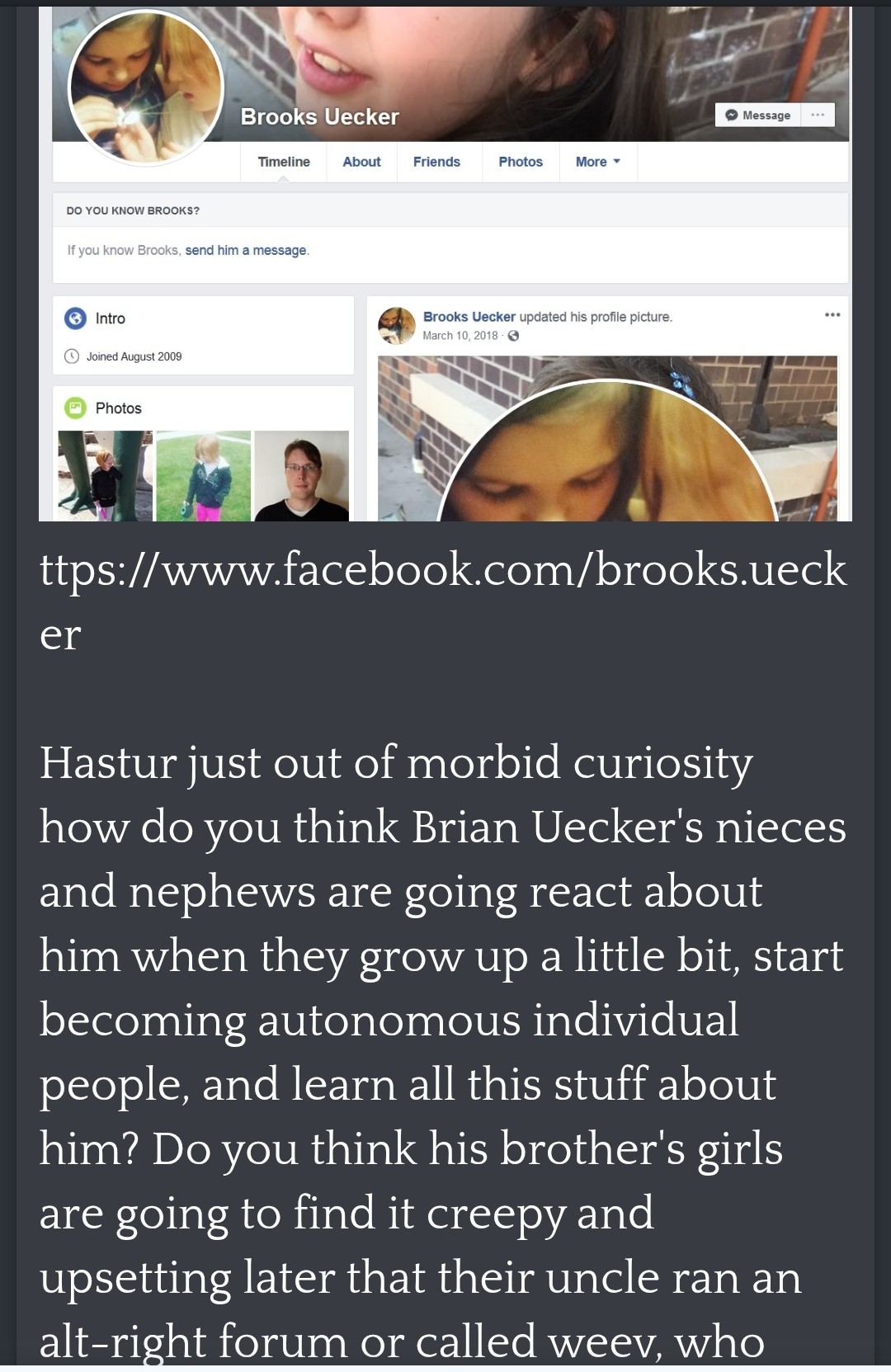 Brian's friend weev wrote an essay about why it's epic for white nationalist men to want to fuck teenage girls, I guess you failed to get to that part. Or his PUA blogger friend who said the exact same thing. He was definitely molesting those kids lol.