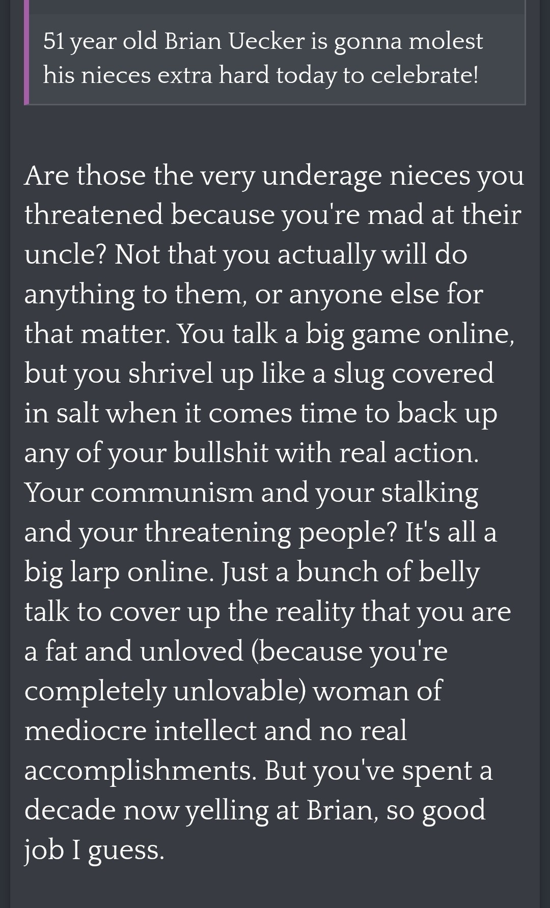 Buddy we know all you do all day is stay in your mom's house gooning to dog porn and drinking when you aren't watching children's cartoons, kiwifails is on KF talking about it.
