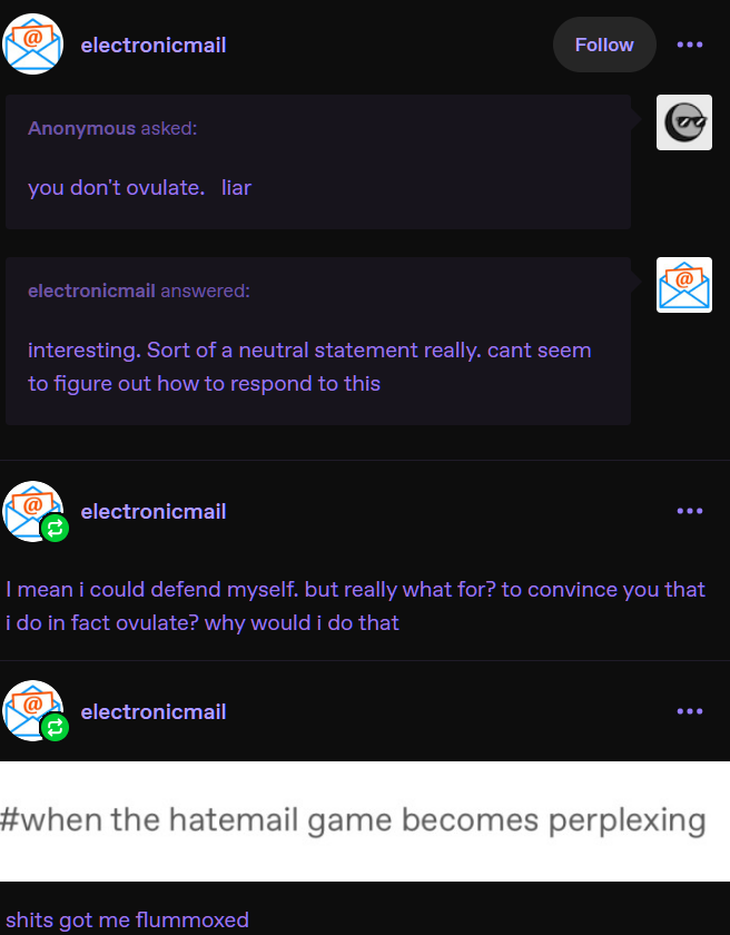 I'm more willing to believe Ashley actually can't ovulate based on the argument xe makes.