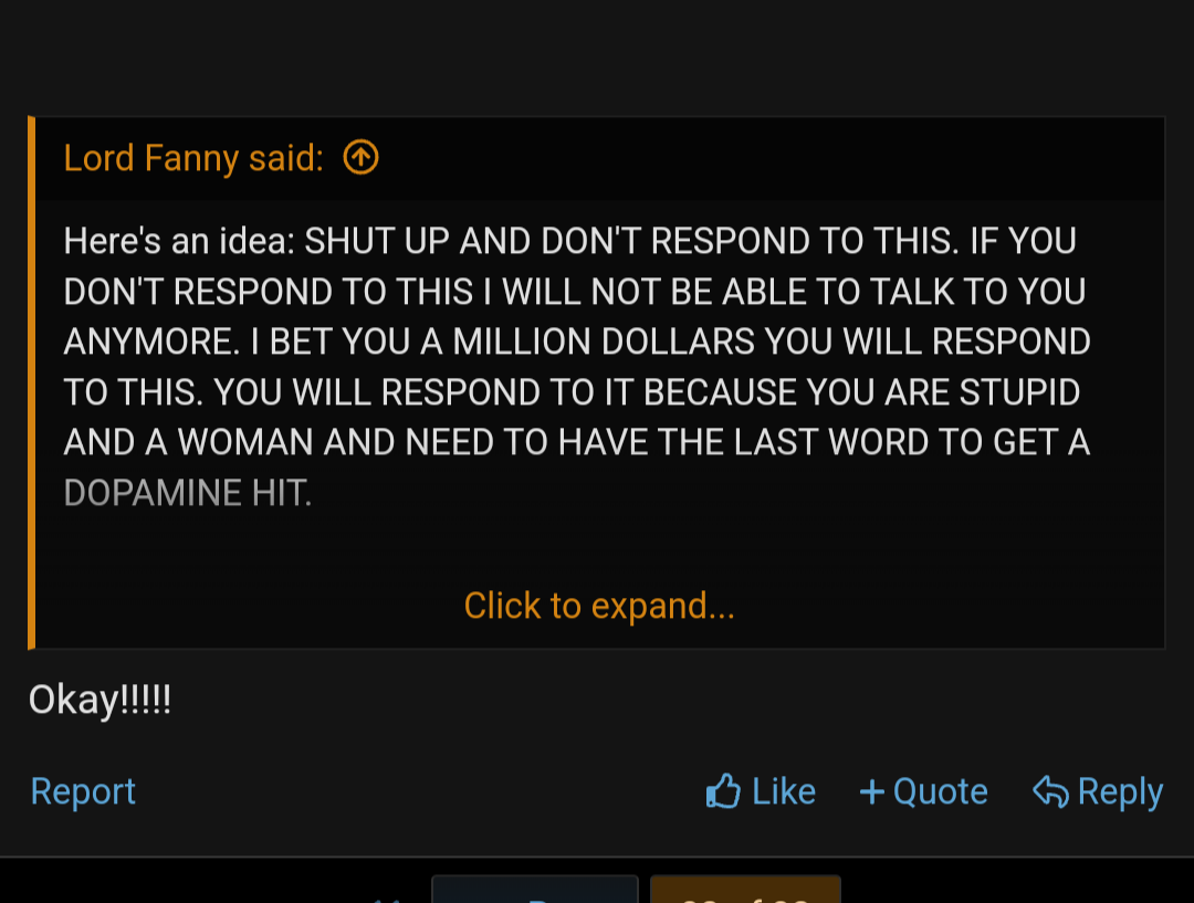 Here's an idea: SHUT UP AND DON'T RESPOND TO THIS. IF YOU DON'T RESPOND TO THIS I WILL NOT BE ABLE TO TALK TO YOU ANYMORE. I BET YOU A MILLION DOLLARS YOU WILL RESPOND TO THIS. YOU WILL RESPOND TO IT BECAUSE YOU ARE STUPID AND A WOMAN AND NEED TO HAVE THE LAST WORD TO GET A DOPAMINE HIT.