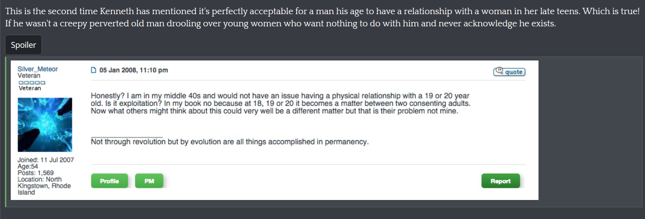 Yeah I could never match those highschool children Kenny was ogling at age 45. He looks like a composite of every pedophile that's ever been on the news and he probably loves sitting across from his local middle school in Warwick pawing himself as the kids load onto buses. You're the same bloated creepo he is, which is why you love moderating for him. Is there a single guy on Onion Farms who isn't attracted to kids?